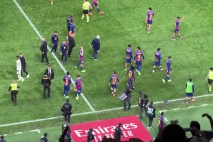 巴萨大巴离开伯纳乌球场时,皇马球迷比中指+唱歌嘲讽