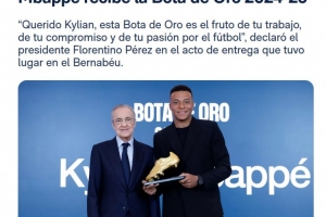 领取欧洲金靴奖!弗洛伦蒂诺祝贺姆巴佩:我们皇马为你自豪