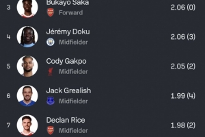 本赛季英超预期助攻排名:姆伯莫2.52次居首,恩迪亚耶、萨卡前三