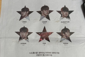 T1选手们登上韩国报纸:史无前例的三连冠 独一无二 总计六次夺冠
