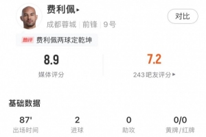本场比赛,费利佩出场87分钟,他的5次射门里有2次射正,并且全部形成进球。更为关键的是,费利佩在比赛下半时制造了对方门将王大雷的红牌,这也成为整场比赛的一大转折点。