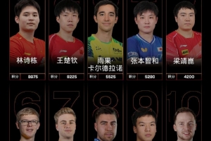 男单方面,林诗栋排名第一,王楚钦排名第二,巴西选手雨果-卡尔德拉诺排名第三,张本智和排名第四,梁靖崑排名第五,小勒布伦排名第六,莫雷加德排名第七,林昀儒排名第八,达科-约奇克排名第九,向鹏排名第十。