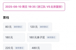 8月4日晚,浙江队开售本周日主场迎战北京国安的中超比赛门票,根据网络售票界面显示,开售半小时后,80元、120元价位的球票以及亲子看台球票均显示售罄。其中,80元票档的球票开售仅2分钟便告售罄!目前,220元票档也已售罄,只剩下180元和480元两档。