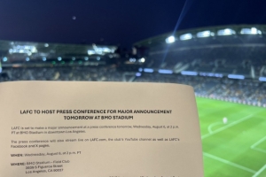 Justin Ruderman社媒晒出公告函,确认洛杉矶FC将在当地时间8月6日14点召开新闻发布会,届时将宣布“重大消息”。