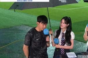 随着争议蔓延,有网友拍到另一个角度的现场照片。照片中孙兴慜右手也拿着麦克风,因此无法撑伞。