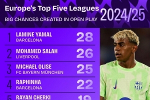 体育资讯9月7日讯 Squawka统计了上赛季球员在五大联赛运动战创造重大机会的次数,并列出榜单,亚马尔居首,萨拉赫、奥利塞二三位。