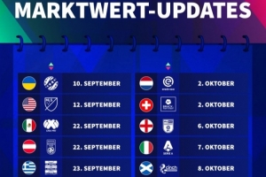 体育资讯9月9日讯 德转市场今日更新,公布了各联赛球员德转身价更新的时间,其中英超联赛将在当地时间10月17日更新,西甲10月2日更新,意甲10月7日更新,德甲10月14日更新,法甲10月10日更新。
