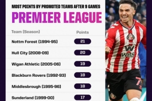桑德兰联赛前9轮豪取17分!在英超历史升班马同期战绩并列第6位