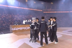 体育资讯9月28日讯 HLE众人在不远处收拾外设,GEN在HLE面前举起奖杯。