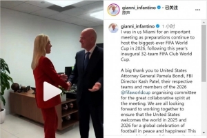 “非常感谢美国司法部长邦迪、联邦调查局局长帕特尔及其各自团队,以及2026年世界杯组织委员会的成员,感谢他们在会议上展现的出色合作精神。我们都期待共同努力,确保美国在2025年和2026年以和平与欢乐的全球足球盛宴欢迎全世界!这是我们的目标,也是我们共同的承诺!”