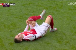体育资讯10月04日讯 英超第7轮,阿森纳vs西汉姆联。比赛第19分钟,厄德高拼抢中膝盖与对手碰撞,倒在地上十分痛苦!