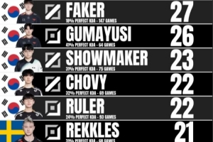 外媒统计S赛正赛选手完美KDA数(0死):Faker147场/27场完美KDA