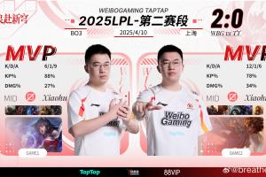 体育资讯4月10日讯 2025LPL第二阶段登峰组常规赛,WBG以2-0战胜TT。