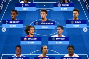 中场:布阿迪(里尔,3000万欧)、马尤卢(巴黎,5000万欧)、奥多贝尔(热刺,2000万欧)、扎伊尔-埃梅里(巴黎,5000万欧)、杜埃(巴黎,9000万欧)