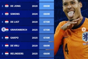 体育资讯10月13日讯 德国转会市场盘点了荷兰球员历史身价榜,范迪克以1亿欧元居首,弗兰基-德容以9000万欧位居次席。