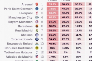 体育资讯10月23日讯 欧冠联赛阶段第三轮比赛战罢,Opta超级计算机更新了各队的夺冠概率,阿森纳21.13%最高,巴黎、利物浦二三位。