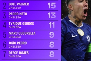 体育资讯10月23日讯 数据网站Squawka盘点了2025年切尔西球员各项赛事参与进球榜单,具体如下(进球+助攻):