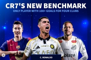 为四家俱乐部都至少打进100球!C罗是首人,莱万、内马尔各3队