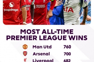 英超历史胜场数榜:曼联760场居首,阿森纳700场次席,利物浦第三