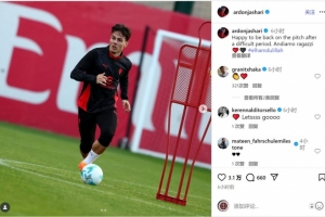 亚沙里社媒晒恢复训练照片:很高兴度过艰难时期后重返球场