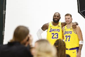 NBA杯小组赛首胜!湖人官方海报:东契奇里夫斯击掌庆祝