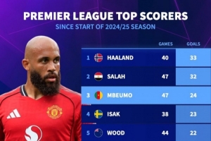 体育资讯10月31日讯 《转会市场》统计了上赛季至今的英超射手榜,哈兰德已经反超萨拉赫居首。