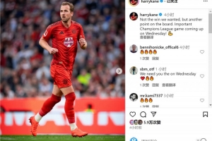 凯恩社媒晒出比赛照片,并写道:“没能获得我们想要的胜利,但又拿到了1分。周三将迎来重要的欧冠比赛!”
