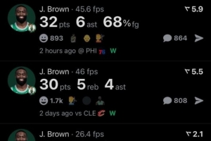 过去四场比赛,杰伦-布朗砍三场30+,其中一场40+,场均能够轰下29.5分。