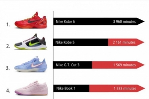 体育资讯11月3日讯 球鞋媒体Kixstats发布了NBA新赛季十月份的球鞋上脚时间排行。前十之中有三双科比的球鞋,分别排在第一、第二和第五。
