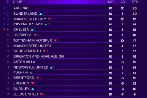 Squawka列去除VAR争议英超排名:阿森纳23分居首,桑德兰20分次席