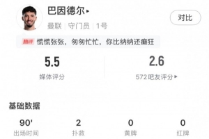 本场比赛巴因德尔顶替奥纳纳出任曼联首发门将,但他的表现也堪称灾难,不仅开球失误让吉马良斯笑纳大礼,比赛中还出现了其他失误造险,赛后他仅获得了5.5分的评分。
