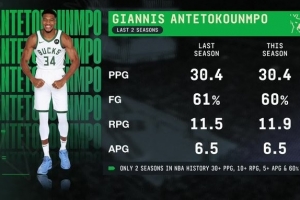 字母哥连续两个赛季场均30+10+5助攻,命中率60%以上,这数据历史上只出现过两次,都是他!