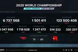 S15决赛T1对战KT海外收视峰值更新为674万,比去年决赛下降1.7%