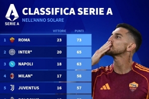 2025年意甲积分榜:罗马73分居首,国米65分、那不勒斯63分