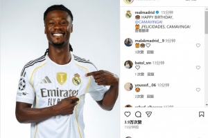 皇马祝卡马文加23岁生日快乐,加盟以来出战191场斩获11冠