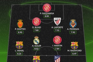 WhoScored西甲第12轮最佳阵:莱万、拉什福德、阿尔瓦雷斯在列