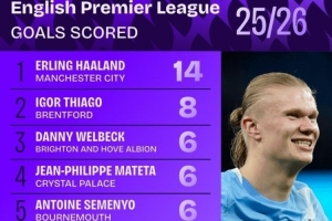 本赛季英超进球榜:哈兰德14球居首,维尔贝克、姆伯莫在列