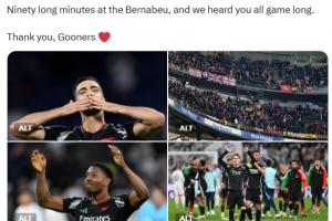 阿森纳官推赛后晒球员、球迷庆祝照:在伯纳乌漫长的90分钟,我们整场比赛都听到了你们的声音。谢谢你们,枪手们 ❤