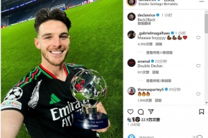 体育资讯4月17日讯 欧冠1/4决赛次回合比赛,赖斯首发出战,帮助阿森纳客场2-1击败皇马,总比分5-1晋级,他两回合比赛都当选最佳球员。