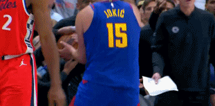 比赛最后时刻莱昂纳德失误出界,球被助教范甘迪拿到,约基奇想要快发球,但和范甘迪抢球没抢过。