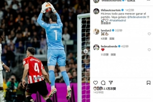 库尔图瓦社媒晒出比赛照片,配文:“我们尽一切努力取得了当之无愧的胜利,多么精彩的进球,巴尔韦德!”