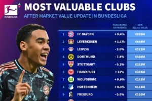 体育资讯3月28日讯 德转在当地时间3月27日更新了德甲球员身价,并列出了德甲各队身价排名,拜仁8.59亿欧居首,勒沃库森、莱比锡、多特、斯图加特2-5位。