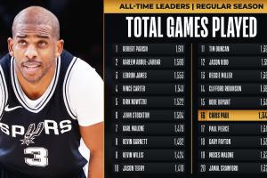 这是保罗NBA生涯第1344场常规赛,超越皮尔斯升至历史第16位,前面一位是科比(1346场)。