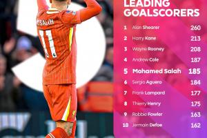 体育资讯04月28日讯 利物浦vs热刺,萨拉赫打入一球,这是他生涯英超第185球,他超越阿圭罗,成为了联赛历史第5射手!
