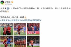 赛后蓉城后卫胡荷韬更新社媒,晒出比赛照并配文写道:“主场+3!太开心拿下这场至关重要的比赛,从前场到后防,每位队友都是今晚的英雄!还不能放松,我们周一继续!”