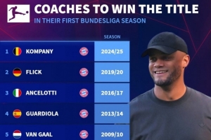 体育资讯5月5日讯 德国转会市场盘点了德甲首秀赛季夺冠的教练,贝肯鲍尔、范加尔、瓜迪奥拉、安切洛蒂、弗里克、孔帕尼在列。