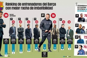 体育资讯3月29日讯 巴萨在西甲补赛3-0完胜奥萨苏纳,延续了弗里克带队的出色表现,《每体》统计显示弗里克是巴萨队史主帅连续不败榜第6,并且总胜率仅次于恩里克。