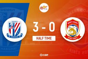 上半场比赛结束,上海申花3-0青岛西海岸。