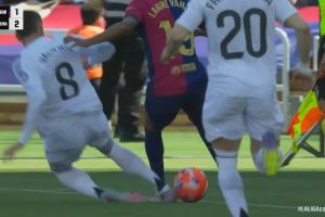 体育资讯05月11日讯 巴萨vs皇马第27分钟,亚马尔边路盘带,巴尔韦德直接飞铲破坏吃到黄牌!