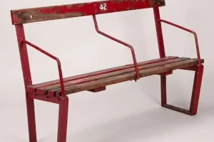 这张长椅为红色,此前被固定安装在老特拉福德球场看台,由于年代久远,经过岁月的洗礼,颜色已经褪色,座位编号41和42也只能隐约看到。